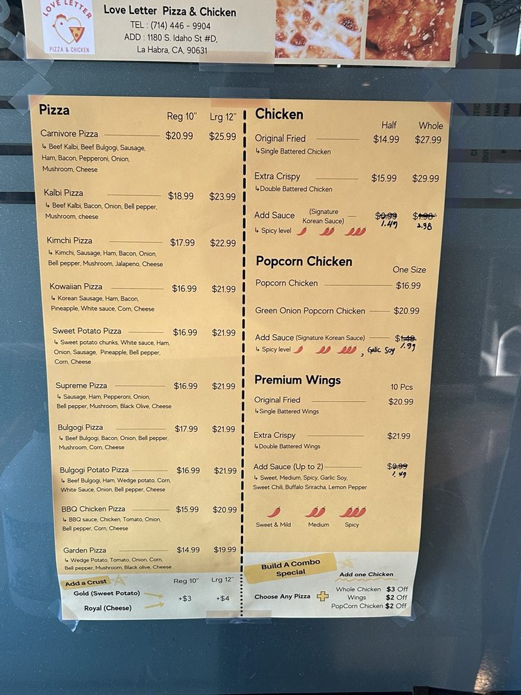 Welcome to Love Letter Pizza & Chicken, a delightful culinary gem nestled in La Habra, CA. This unique establishment artfully combines the hearty flavors of Korean cuisine with the beloved comforts of pizza and fried chicken. With its casual yet trendy ambiance, Love Letter is an inviting spot that's perfect for families, groups, or anyone looking to savor a delicious meal.